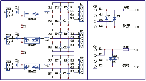 SW03A設計上采用 金曼頓小型功率擴展固態(tài)繼電器,驅動三路單相或三相大功率反并聯晶閘管或雙向晶閘管。輸入電平和日 本島電占空比(P型,SSR)調節(jié)輸出類型儀表兼容,例如:SR90、SR1/3/4等系列。其安裝方式為DIN標準導軌或四孔螺絲。輸入使用UL標準的電力接線端子,輸出使用可拔插端子,方便用戶使用。220V AC和380V AC下均可工作,配套S302Z擴展固態(tài)繼電器(無阻容吸收回路)。參照電路原理圖,在前級固態(tài)繼電器導通時,強制后級大功率晶閘管導通,對后級晶閘管無特殊要求。以通道一為例,電路中元件的具體作用如下:I1是前級固態(tài)繼電器的限流電感;R1、R2為陰極電阻,用于提高靜態(tài)dv/dt;C1、R3為阻容吸收回路;L1為輸入指示發(fā)光二極管;每路固態(tài)繼電器要求輸入不小于4V,驅動電流不小于15mA(最大不超過30mA)。出廠為J1,J2短路的三相工作方式,此時僅保留L1發(fā)光二極管作為輸入指示。J1、J2開路為三個獨立的單相。端子D1- D3可參照電路原理圖接線。此外,當驅動兩支單向晶閘管時,可安裝兩只反向保護二極管D1- D8(1N4007)。內部的阻容吸收元件為180Ω和0.1μF,也可根據實際負載情況外配阻容吸收器。